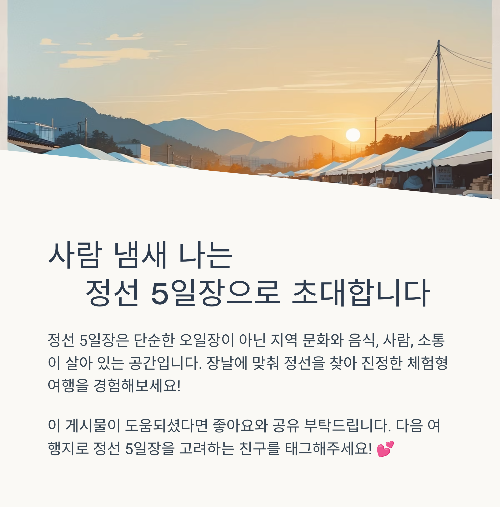 정선 5일장은 ‘오일장’이라는 말보다 지역 문화와 음식, 사람, 소통이 살아 있는 공간입니다. 장날에 맞춰 정선을 찾는다면, 단순한 여행이 아닌 사람 냄새나는 체험형 여행이 될 거예요.