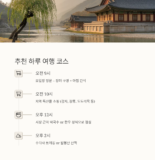지역 특산물 쇼핑 (감자, 장류, 도토리묵 등)