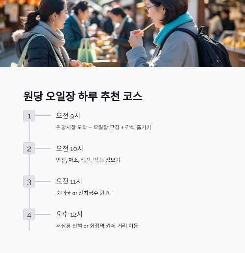 고양 원당 오일장은 도심 속에서 전통의 정취, 실속 있는 장보기, 따뜻한 먹거리를 경험할 수 있는 소중한 생활형 전통시장입니다. 시장 구경 + 근처 관광지를 묶으면 반나절 코스로도 딱 좋아요!