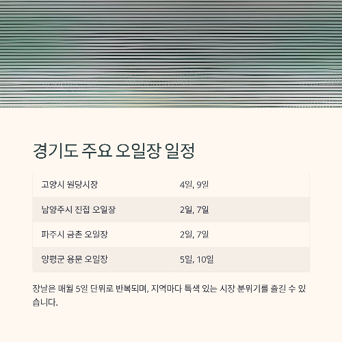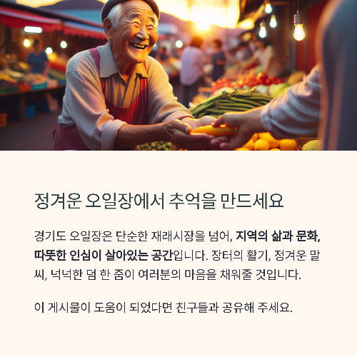 경기도는 도시와 농촌이 어우러진 지역답게 "정기적으로 열리는 오일장(5일장)"이 여전히 활발하게 운영되고 있습니다.