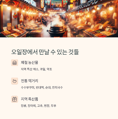 ※ 장날은 "매월 5일 단위 반복 (1일, 6일 / 2일, 7일 / 3일, 8일 등)"로 운영되며, 장터마다 일부 유동성 있음