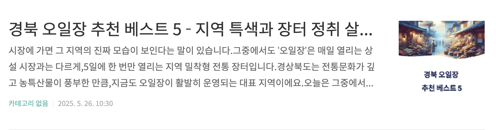 "오일장(5일장)"은 단순히 장을 보는 곳을 넘어 지역의 문화, 인심, 삶의 리듬을 느낄 수 있는 공간입니다.