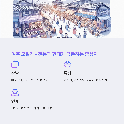 | 5 | 여주 한글시장 | 5, 10일 | 관광+장터 체험 가능, 여주한우 인기 |