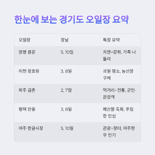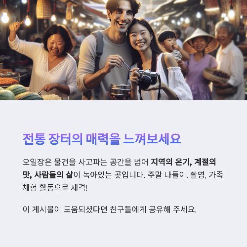 경기도 오일장 투어는 주말 나들이, 촬영, 블로그 콘텐츠, 가족 체험 활동으로도 제격입니다.