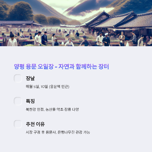 1️⃣ 양평 용문 오일장 – 자연과 함께하는 장터