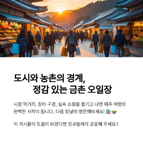금촌 오일장은 도시와 농촌의 경계에서 정감 있는 전통시장 문화를 그대로 유지하고 있는 곳입니다. 시장 먹거리, 장터 구경, 실속 쇼핑을 즐기고 나면, 파주 여행의 시작으로도 딱 맞는 하루가 완성되죠. 🛍️🍲