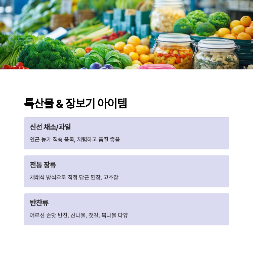 | 🌿 주요 품목 | 농산물, 수산물, 과일, 장류, 반찬, 생활용품, 의류 |