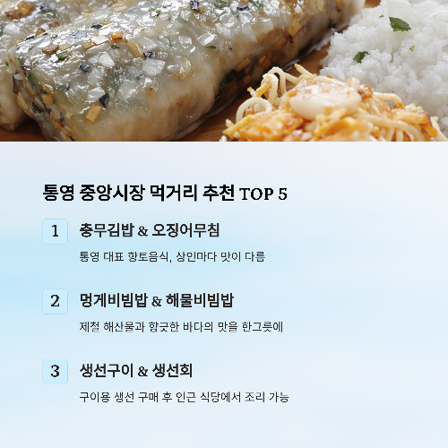 | 📸 사진 촬영 | 충무김밥 노점, 어물전, 벽화마을 연계 촬영 가능 |
