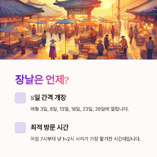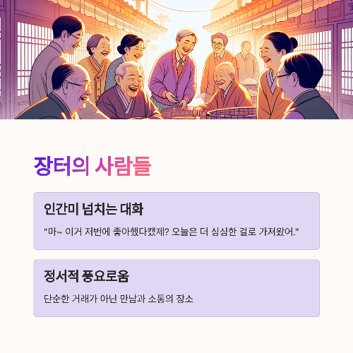 빠르게 변화하는 시대에도 장날만큼은 여전히 따뜻한 인간미와 정감 어린 소통이 살아 숨 쉬는 공간입니다.