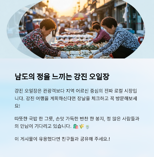 강진 여행을 계획하고 계시다면, 장날을 꼭 체크하고 강진 오일장에 들러보세요! 따뜻한 국밥 한 그릇, 손맛 가득한 반찬 한 봉지, 정 많은 사람들과의 만남이 기다리고 있습니다. 🛍️🌾🍵