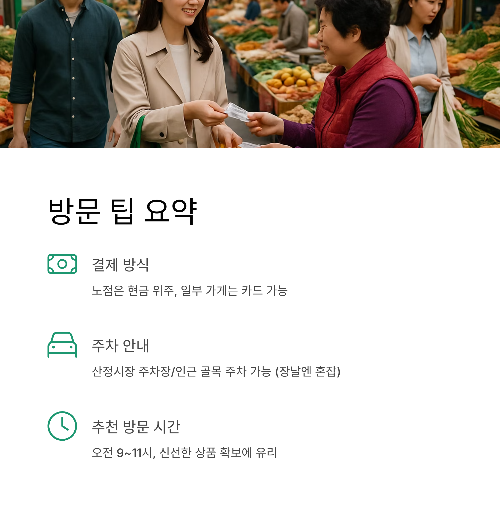 | 🚗 주차 안내 | 산정시장 주차장 / 인근 골목 주차 가능 (장날엔 혼잡 주의) |