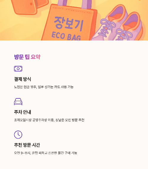 | 🛍 쇼핑 준비물 | 아이스팩, 장바구니, 현금지갑, 편한 신발 |