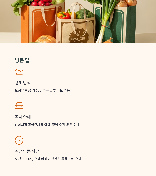 | 🚗 주차 안내 | 해남시장 공영주차장 이용 가능 / 장날 오전 방문 추천 |