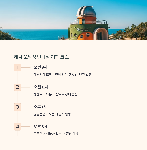 | 🧭 연계 관광지 | 땅끝전망대, 대흥사, 두륜산 케이블카, 해남공룡박물관 |