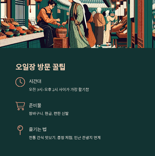 - 즐기는 법: 전통 간식 맛보기, 흥정 체험, 인근 관광지와 연계한 여행 코스 구성.