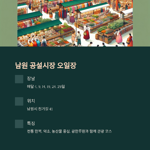 - 특징: 전통 한복, 약초, 농산물이 중심이며, 인근 광한루원과 함께 관광 코스로 인기.