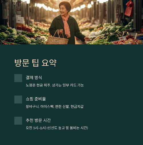 | 🛍 쇼핑 준비물 | 장바구니, 아이스팩, 편한 신발, 현금지갑 |