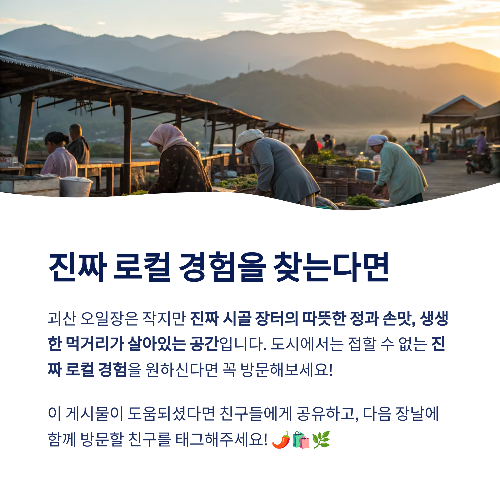괴산 오일장은 작고 아담하지만, 진짜 시골 장터의 따뜻한 정과 손맛, 생생한 먹거리가 살아있는 공간입니다. 장날에 맞춰 방문하면 괴산의 매력을 더욱 깊게 느낄 수 있어요. 도시에서는 쉽게 접할 수 없는 진짜 로컬 경험을 원하신다면, 괴산 오일장, 강력히 추천드립니다. 🌶️🛍️🌿