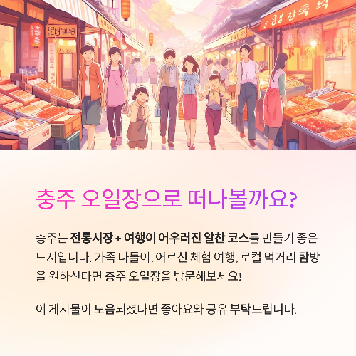 충주는 교통이 편리하고 관광지도 많아 전통시장 + 여행이 어우러진 알찬 코스를 만들기 좋은 도시입니다. 충주 오일장은 그 중심에서 정감 있는 시골 장터 경험과 실속 있는 장보기를 함께 제공해요. 가족 나들이, 어르신 체험 여행, 로컬 먹거리 탐방을 원하신다면 충주 오일장을 추천드립니다!